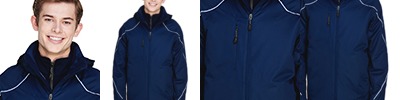 liner: 100% polyester w/100% polyester fleece, 7.4oz./yd2/252gsm; SHELL: 100% polyester twill, 4.4 oz./yd2/150 gsm; SHELL LINING: 100% polyester taffeta with embossed print; inside storm placket with brushed tricot chin guard and collar; centre front and lower pockets with reverse coil zippers; zip-off hood with back adjustable tab; adjustable cuffs with tabs; chest pocket with invisible zipper; brushed tricot-lined pockets; thermal retention shockcord at hood and drop back hem; contrast stitching along flat reflective piping; audio port access through inside chest pocket; flat reflective piping at front, back and sleeves; audio port access through inside chest pocket; inside placket with brushed tricot-lined collar and pockets;