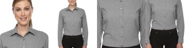 100% polyester mechanical stretch two-tone melange; 2.9 oz./yd2/97 gsm with moisture wicking performance; two-tone mélange fabric; hidden button-down collar; back yoke with side pleats; double-needle flat-felled side and underarm seams; tailored adjustable cuffs with buttoned sleeve plackets; front and back princess seams;