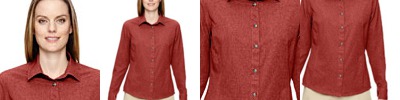4.4 oz., 100% two-tone polyester; moisture-wicking performance; contrast coverstitch details ; structured collar stand with integrated collar stays; back yoke; adjustable cuffs; front and back princess seams;