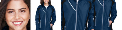 3.5 oz., 100% polyester fully seam-sealed, two-layer waterproof and breathable s; 3.2 oz, Dyed-to-match 100% polyester micro-mesh lining throughout; 6,000 mm waterproof rating and 6,000 g breathability; rollaway three-piece hood with 1¼" rain bill; waterproof reverse coil zipper at center front and pockets with semi-autolock rubber pull tabs; black contrast side panels; reflective tape at right-chest and front pockets; hook and loop hem closures at cuffs; drop-tail hem and elastic shockcord protects from the elements;