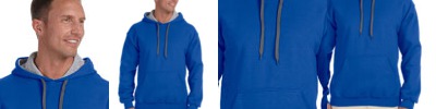 7.75 oz., 50% cotton, 50% polyester Heavy Blend™ fleece; Air jet yarn creates a smooth, low-pill surface for printing; Contrasting jersey-lined hood; Dark Grey flat drawcord and twill tape; 1x1 spandex ribbed cuffs and waistband; Durable double-needle stitching throughout; Roomy pouch pocket;