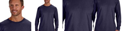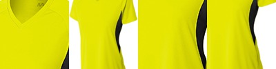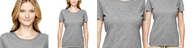 4.5 oz., 100% polyester; Moisture management jersey; Ribbed collar; Taped shoulder to shoulder with EasyTear™ label; Double-needle hemmed sleeves and bottom;