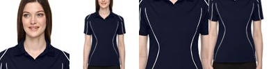 100% poly birdseye mesh fabric block details, 3.8 oz./yd2/128 gsm; 100% polyester snag protection tricot,4 oz./yd2/135 gsm; moisture wicking, antimicrobial and UV protection performance; Self fabric open placket; Matching flat knit collar; Contrast piping on front body, sleeves and shoulders; Contrast back inserts; Fabric block panels at front sleeves, shoulders and sides;