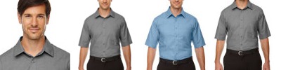 4.4 oz., 100% two-tone polyester; moisture-wicking performance; contrast coverstitch details ; structured collar stand with integrated collar stays; back yoke; adjustable cuffs; back waist darts;